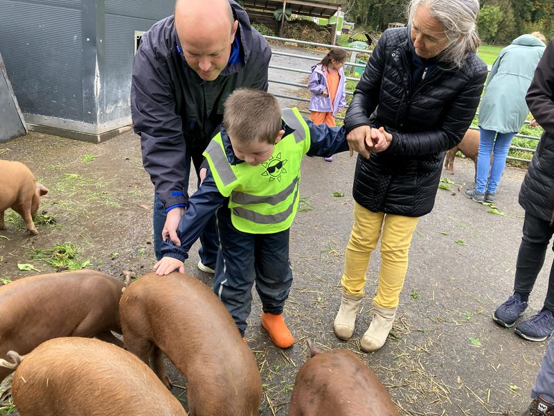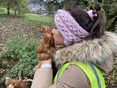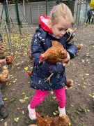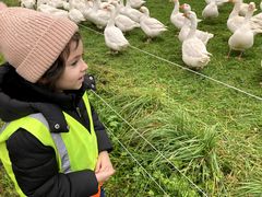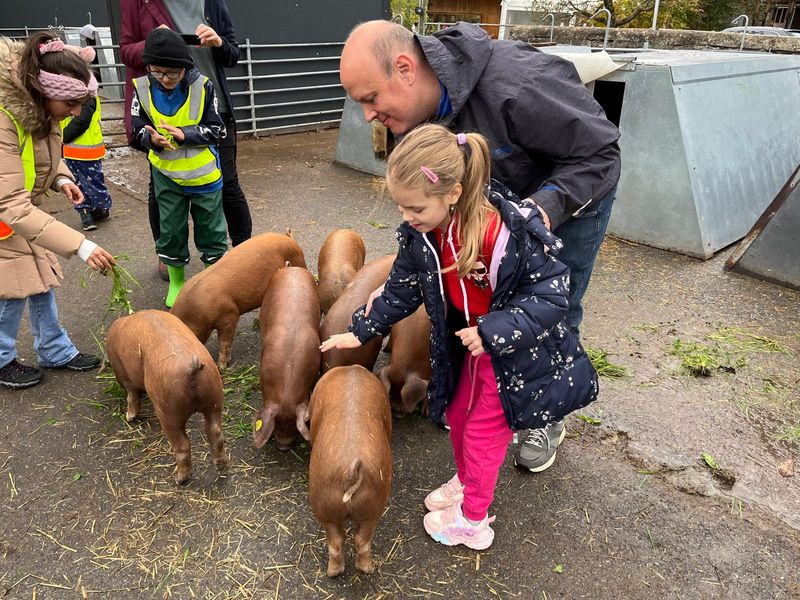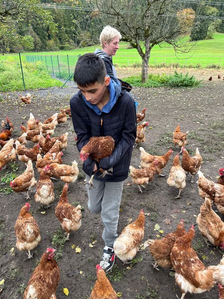 Wir durften ganz nahe zu den Schweinen und diese mit Grünpflanzen füttern. Viele Schüler:innen waren mutig. Die Gänse schnatterten wie wild. Wenn wir aber alle zusammen laut „Psst!“ riefen, hörten sie kurze Zeit auf und waren still. Manche der Schüler:innen trauten sich, ein Huhn aufzunehmen, es zu halten und sogar zu liebkosen. Die Hasen zu streicheln war für manche Kinder ein besonderes Erlebnis. Einige Kinder fühlten sich auf dem Spielplatz wohler als bei den Tieren.